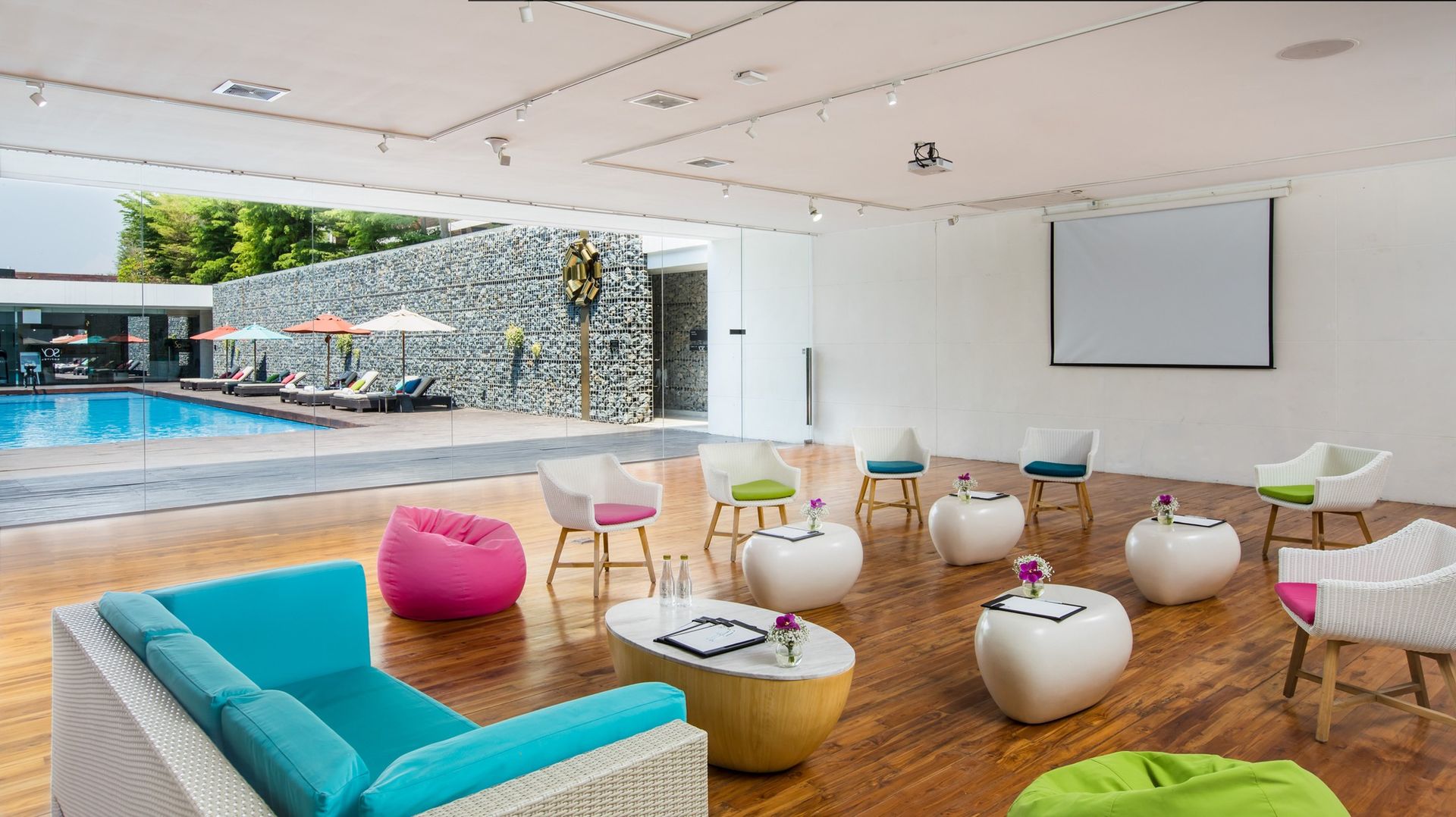 The rooms are designed in a contemporary style, with some featuring a private pool and all offering modern amenities like a Mac Mini.